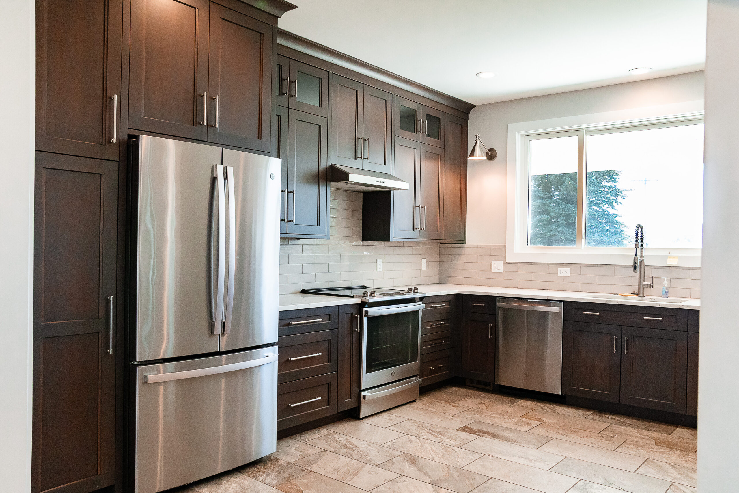 Modern kitchen in Lakeview Village with dark wood cabinets, stainless steel appliances, light tile backsplash, and a large window above the sink.