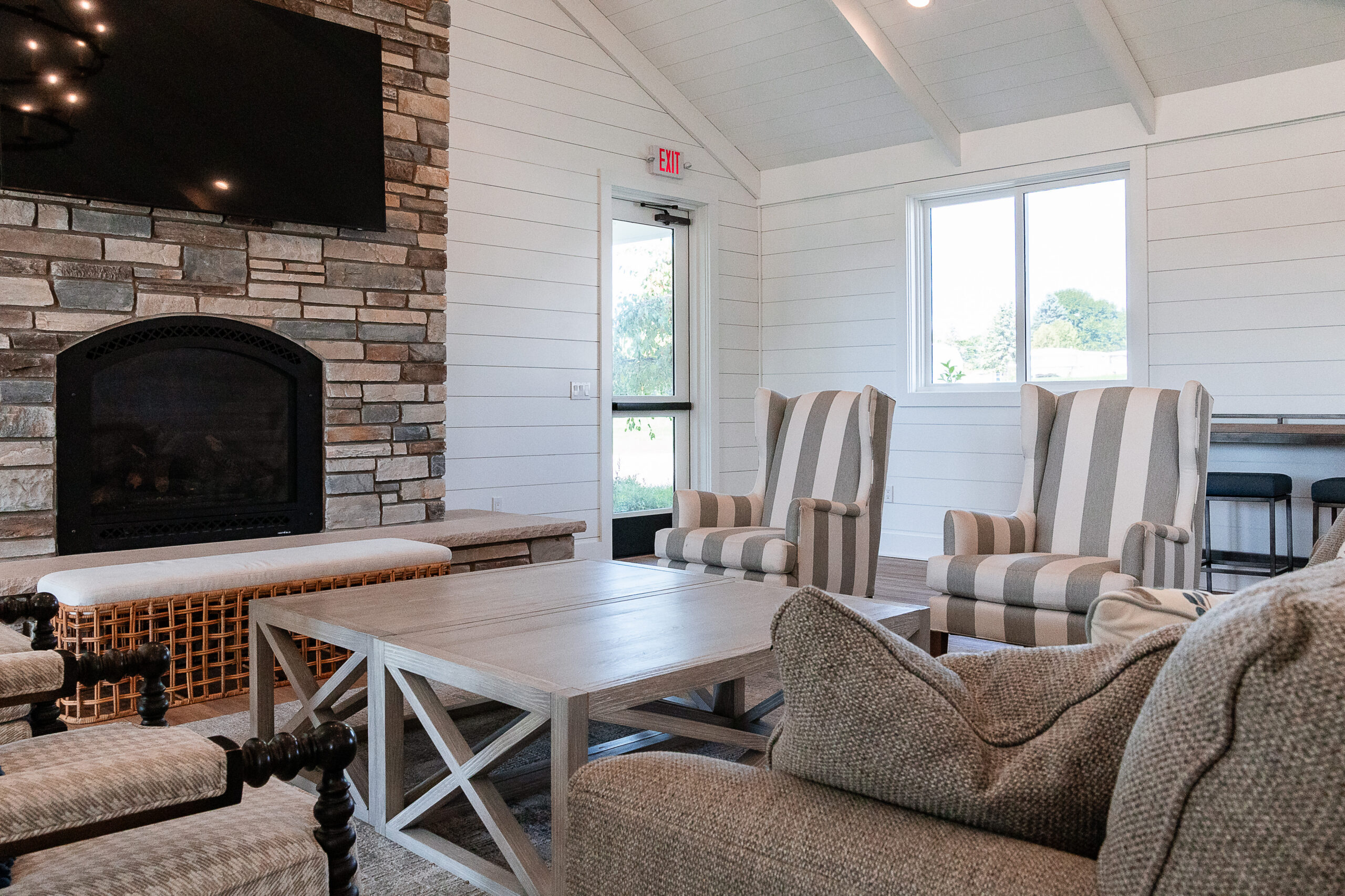 A living room in Lakeview Village features striped armchairs, a beige sofa, a light wood coffee table, a stone fireplace, and large windows flooding the space with natural light.