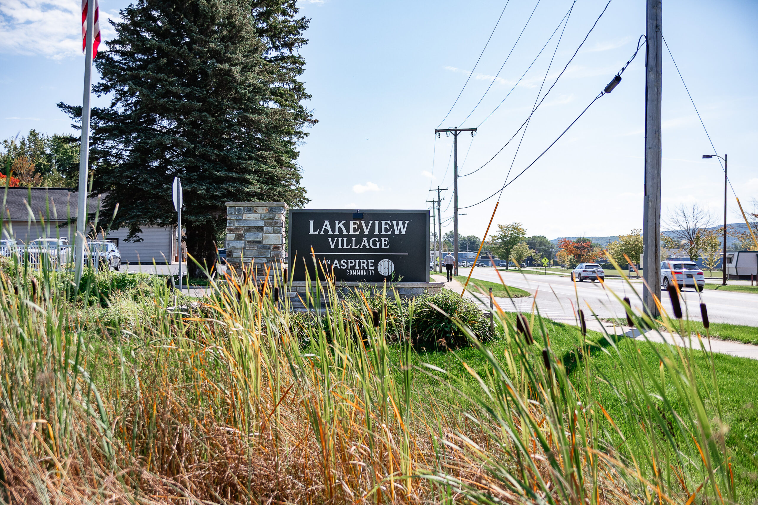 A sign reading "Lakeview Village, Aspire" stands by a roadside in Lakeview Village, with grass, power lines, trees, and passing vehicles visible in the background.