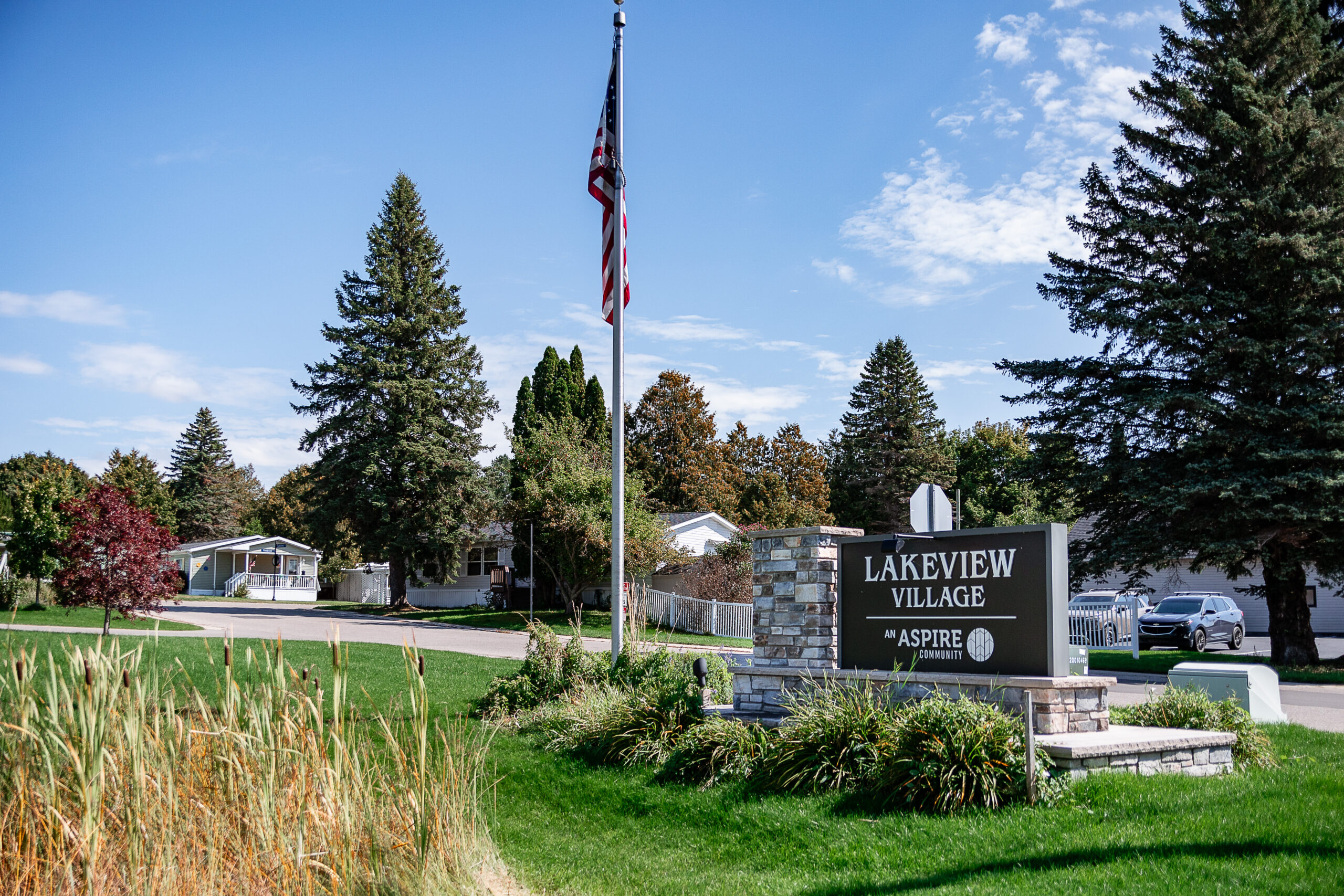 A stone and metal sign reading “Lakeview Village by Aspire” stands near an American flag, green lawn, trees, and residential homes beneath a clear blue sky in Lakeview Village.