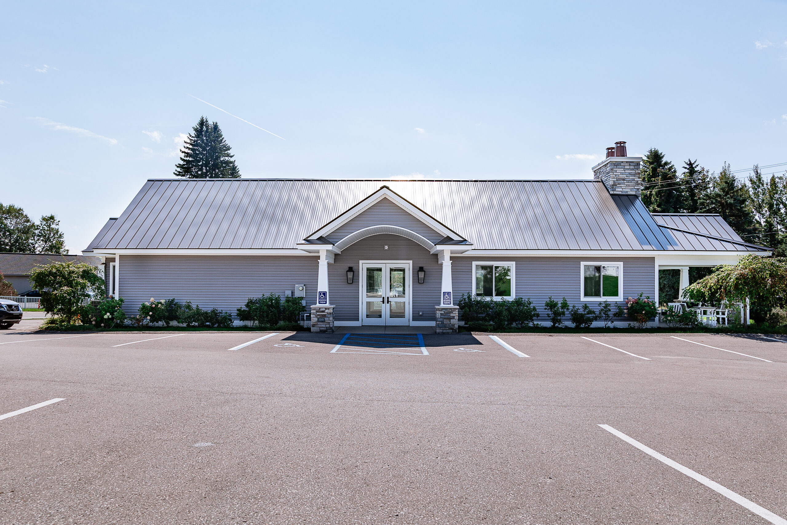Single-story building with gray siding, a metal roof, and a central entrance, set in front of an empty parking lot at Lakeview Village on a clear day.