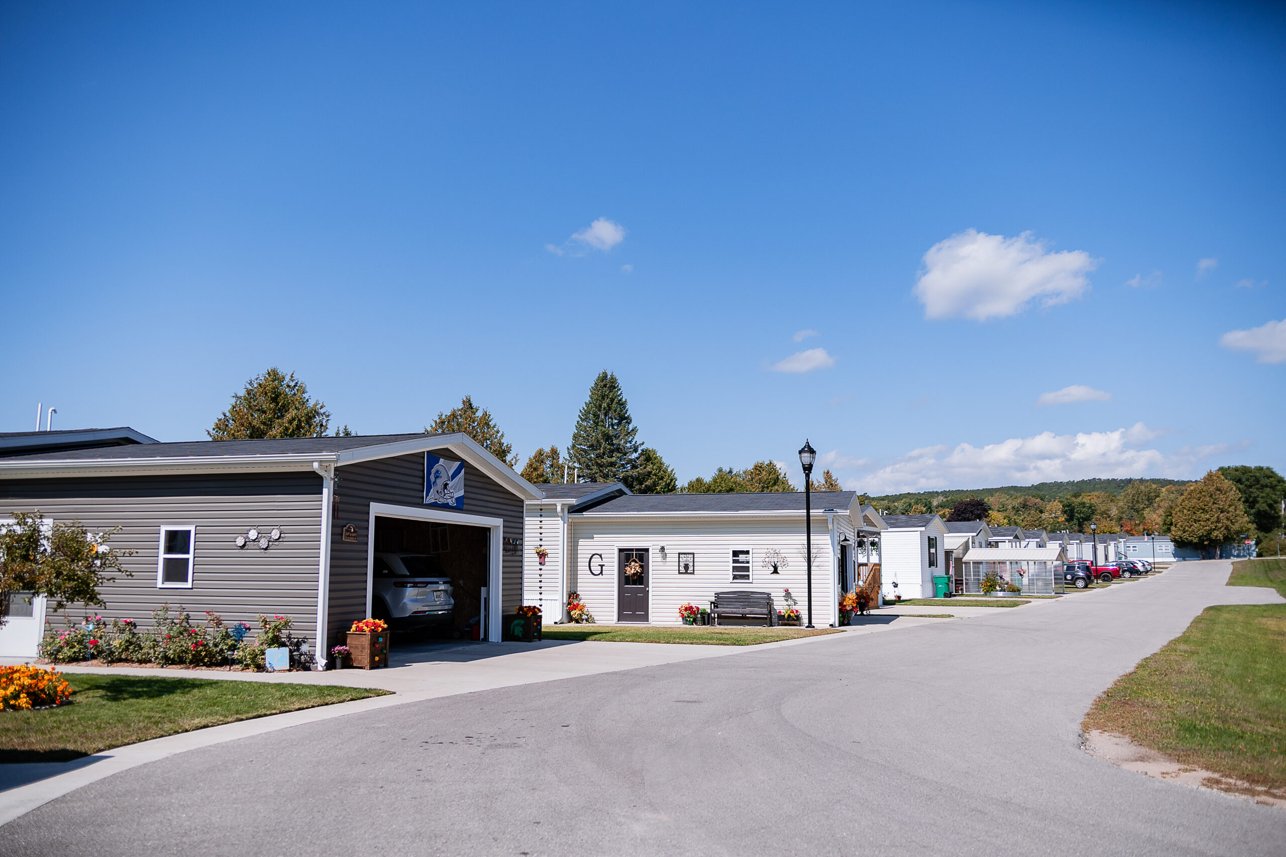 A row of manufactured homes with driveways at Lakeview Village on a clear, sunny day; a car is parked in one garage, and trees are visible in the background.