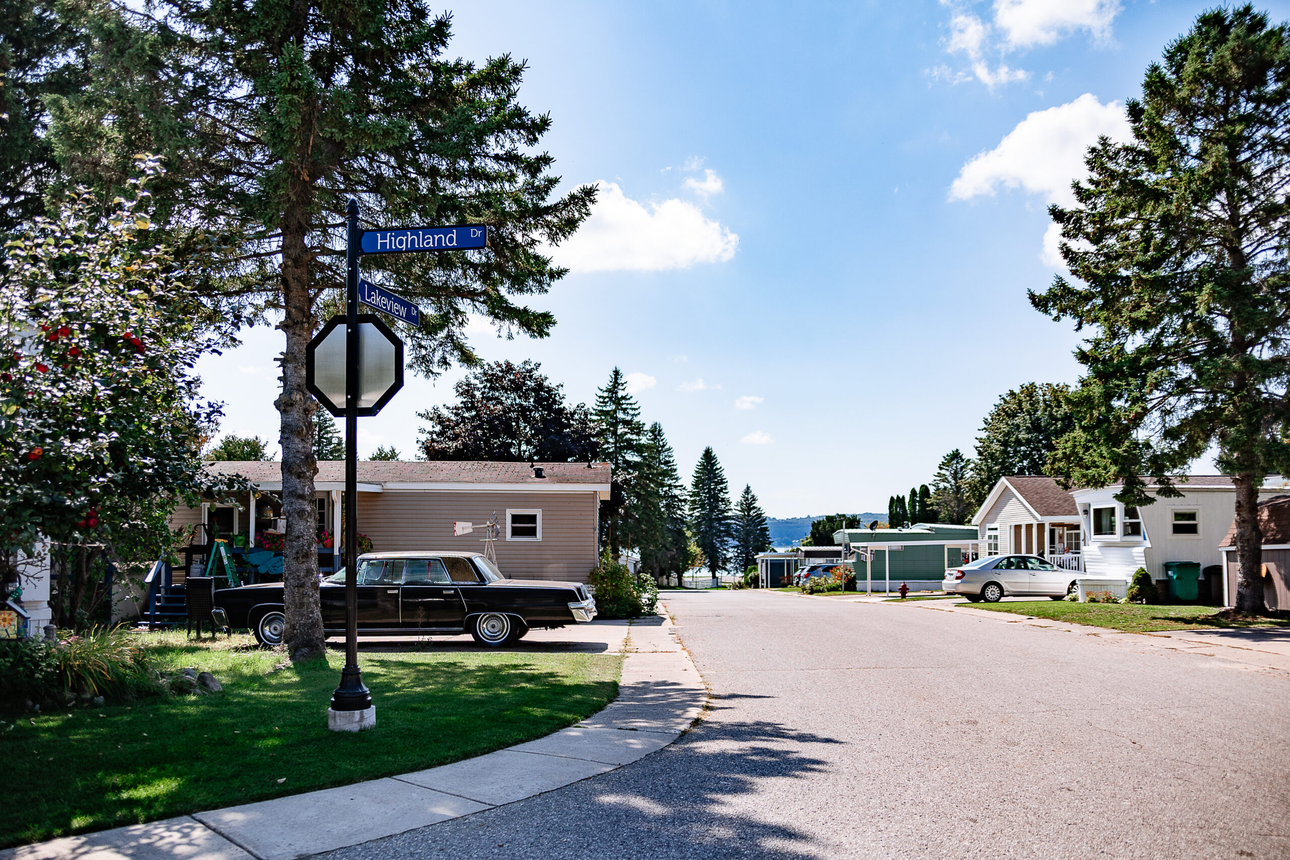 A suburban street corner in Lakeview Village with a Highland street sign, a stop sign, parked cars, and single-story houses under a sunny sky with scattered clouds.