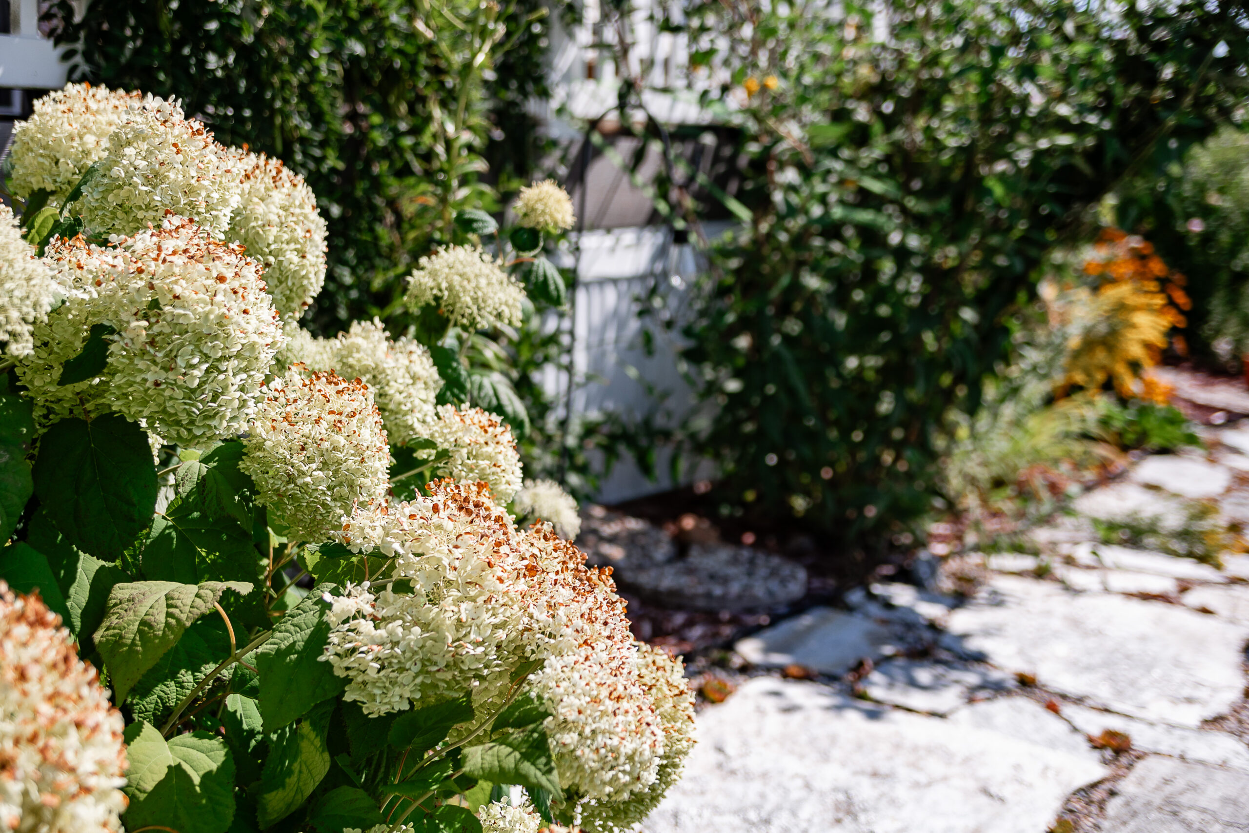 White hydrangea flowers bloom in a garden beside a stone path at Lakeview Village, with green foliage and a building visible in the background.
