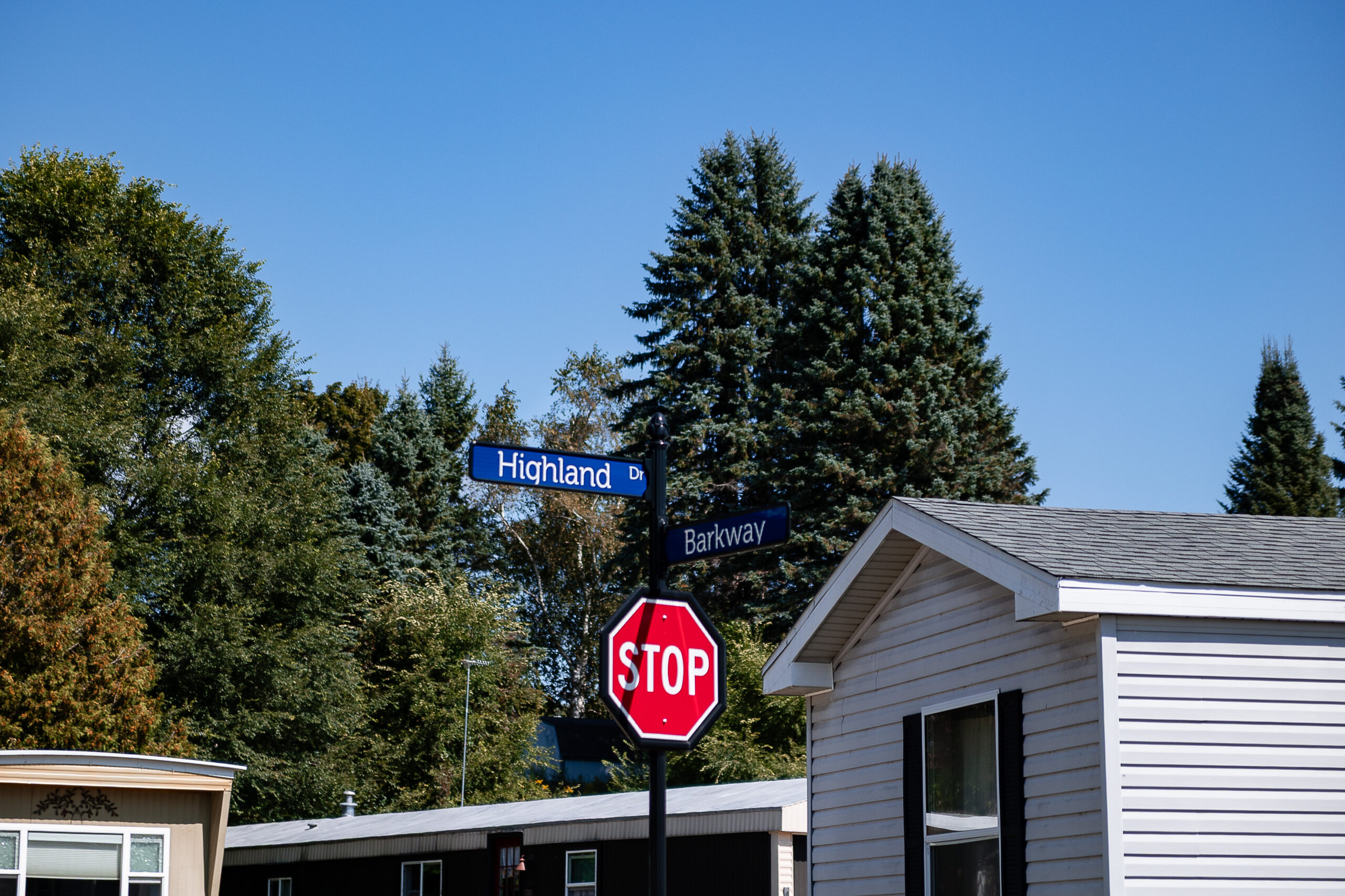 A street sign at the intersection of Highland Dr and Barkway in Lakeview Village, a residential area with trees, a stop sign, and a white house visible.
